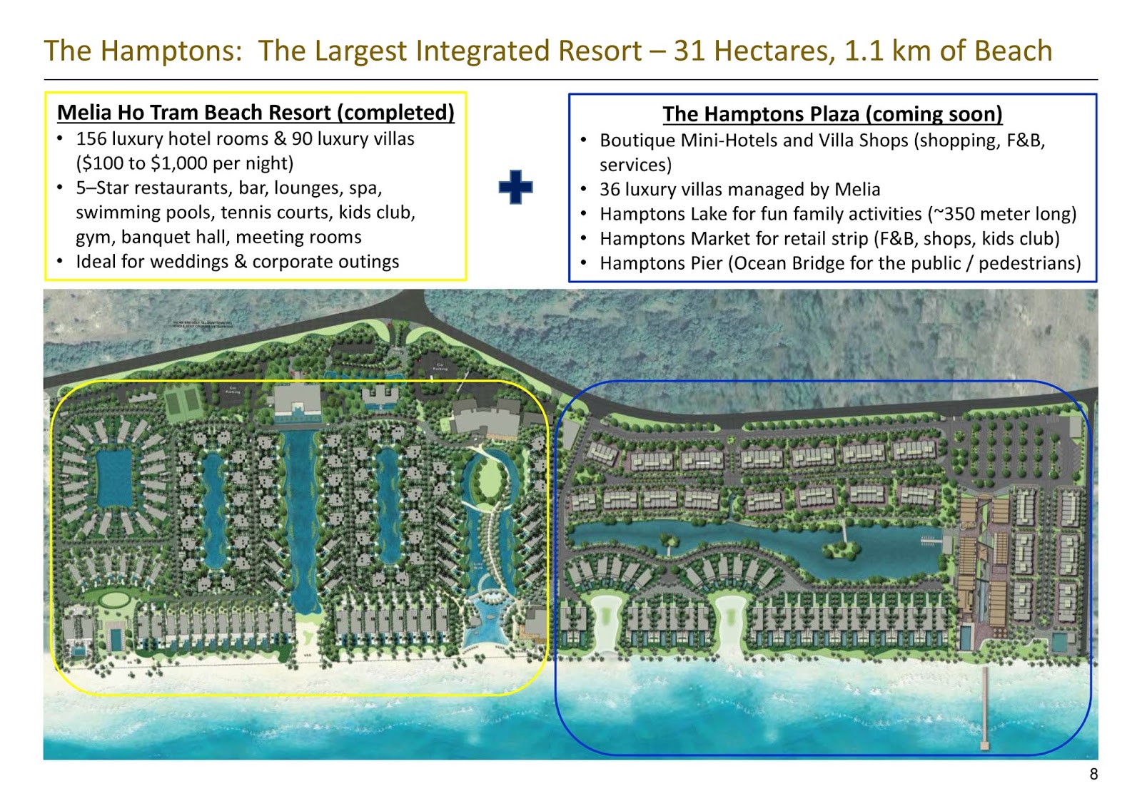 Đến nay các giai đoạn của dự án Hamptons đã lần lượt được thực hiện đúng tiến độ, hiện thực hóa cam kết lợi nhuận cho các nhà đầu tư, tô điểm thêm bản đồ du lịch Việt Nam và hình thành thiên đường nghỉ dưỡng lý tưởng "Thủ phủ resort nghỉ dưỡng Hồ Tràm " cho các khách du lịch. Khẳng định uy tín tên tuổi của chủ đầu tư và cam kết mạnh mẽ về tốc độ, tiến độ của dự án với khách hàng.